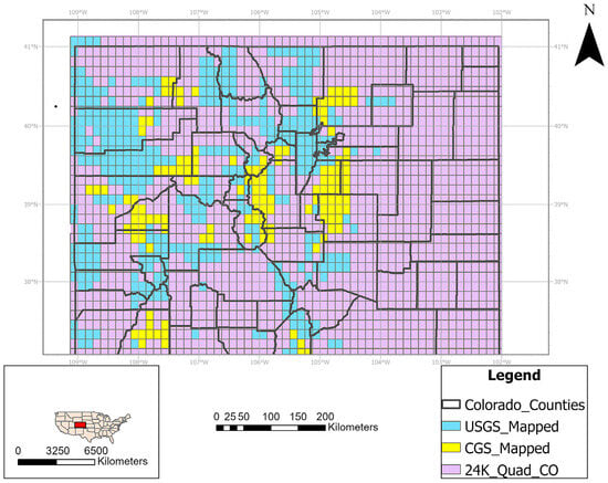 Figure 3 shows the 1:24,000-scale 7.5 min quadrangles in Colorado, some of which extend across state borders into Wyoming, Utah, New Mexico, Nebraska, Kansas, and Oklahoma. In total, there are approximately 1942 quadrangles, with just over 700 of these mapped. These include 382 mapped by the United States Geological Survey (USGS) and 321 mapped by CGS. These geologic maps provide critical baseline data for interpreting the genesis of landforms, subsurface conditions, and hazard susceptibility. Where geologic mapping is not yet available, LiDAR-based mapping and terrain analysis provide a foundational dataset for identifying priority zones and initiating further geologic investigations.