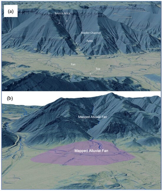 (a) Three-dimensional illustrations of alluvial fan terminology and (b) a mapped alluvial fan for this study.