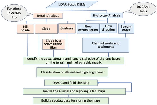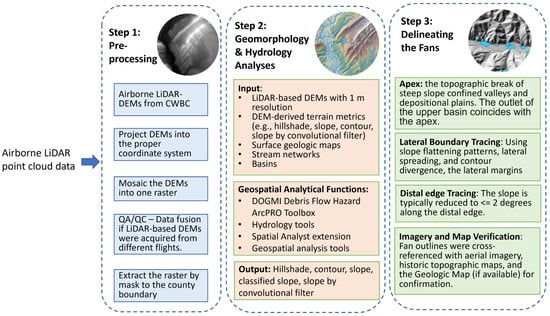 This LAF mapping project intends to identify and map, at a scale of 1:24,000, the extent of fan landforms with unprecedented accuracy. This includes interpretations where anthropogenic activities have altered the fans (such as roadcuts, housing developments, and human-made drainage ditches). The use of 1-m-resolution LiDAR-based DEMs is essential for accurately delineating fan landforms, as finer-scale topographic data significantly enhances the detection of fan margins, slope breaks, and sediment pathways [13]. The methods for identifying fans from the available LiDAR imagery consist of three steps, which are illustrated in Figure 7.