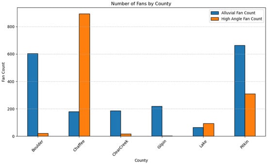 Chaffee County’s high count of high-angle fans (894) reflects its steep mountainous terrain and extensive talus development. In contrast, Gilpin, Boulder, and Clear Creek Counties’ lower numbers may relate to broader valleys and a higher frequency of coalesced bajadas. Pitkin County’s high-angle fans (309) were somewhat lower than Chaffee County’s, due in part to the river valleys and slope delineation across Pitkin County that is significantly different from that in Chaffee County.