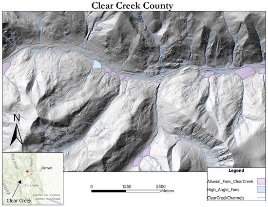 Recent advances in remote sensing have significantly improved the ability to delineate and analyze alluvial and high-angle fans. High-resolution LiDAR-based DEMs are particularly effective in capturing fine-scale topographic features such as slope discontinuities, incised channels, and subtle depositional lobes that may be obscured in traditional methods. Several studies have demonstrated the utility of LiDAR in characterizing fan morphology and enhancing debris flow susceptibility assessments across diverse geographic settings [13,14,15]. These works demonstrate how LiDAR-derived terrain metrics improve reproducibility and mapping accuracy, providing a foundation for both regional hazard screening and site-specific planning. Building on these methods, our study applies similar principles to wildfire-prone landscapes in Colorado, using a systematic approach to distinguish between fan types based on slope, topographic context, and connected drainage features.