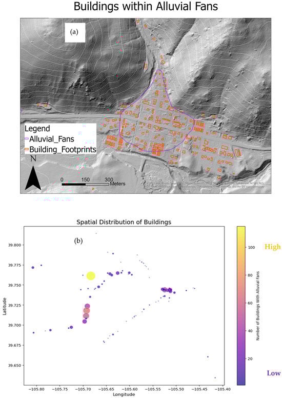 (a) Existing structures associated with the alluvial fans in Clear Creek County. (b) Spatial distribution of buildings within fans in Clear Creek County.
