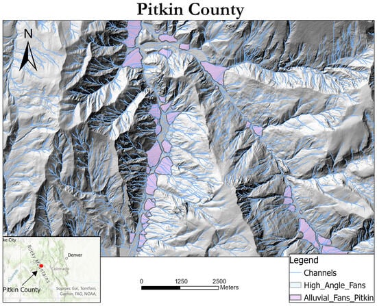 Pitkin County encompasses approximately 973 square miles (2520 square kilometers) and exhibits a range of geomorphological features shaped by its mountainous terrain, glacial past, and river systems. This region encompasses the Elk Mountains, which include Aspen Mountain and the Roaring Fork River valley. Common geomorphologic studies in the areas include investigating river stability, the effects on wetlands, and risks associated with debris flows after wildfires. Figure 13 displays a portion of the county with many mapped alluvial fans and a few high-angle fans.