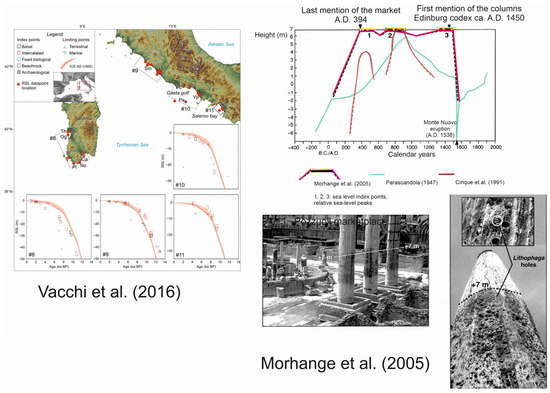 Sea level changes and bradyseismic cycles, adapted from Vacchi et al. [47] and Morhange et al. [45], respectively. On the left, Vacchi et al. [47] have summarized the relative sea level reconstructions at several sites of Southern Italy, including southwestern Sardinia (#8), north–central Latium (#9), the Gulf of Gaeta (#10) and the Salerno Bay (#11). The approximate locations of the relative sea level data points are represented as red dots. Key: Th, Tharros; Mi, Is Mistras; Or, Gulf of Oristano; Pi, Piscinni Bay and Malfatano Cape; St, Sant’Antioco; Ca, Cagliari; No, Nora; Cv, Civitavecchia; Sm, Santa Marinella; Ti, Tiber Delta; Fo, Fondi coastal plain; Fr, Formia; Po, Pontine Archipelago; Vp, Volturno coastal plain; Sp, Sele coastal plain. On the right, the data of Morhange et al. [45] have been reported. These data regard the Pozzuoli marketplace (“Serapeo”) and the construction of a new relative sea level curve, as compared with previous curves, adapted from Parascandola [42] and Cinque et al. [43].