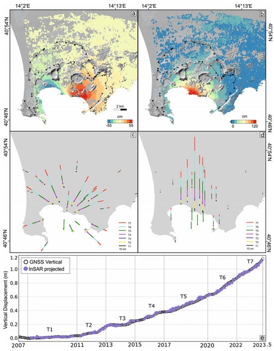 (a,b) Vertical cumulated displacements obtained by combining InSAR ENVISAT (2007–2011) and COSMO-SkyMed data (2011–2023), respectively. (c,d) Horizontal and vertical GNSS cumulated displacements, respectively, separated into seven time periods during 2007–2023. (e) Vertical displacement time series measured at RITE (black dots) and projected vertical time series from ENVISAT and COSMO-SkyMed datasets (modified after Astort et al.) [48].