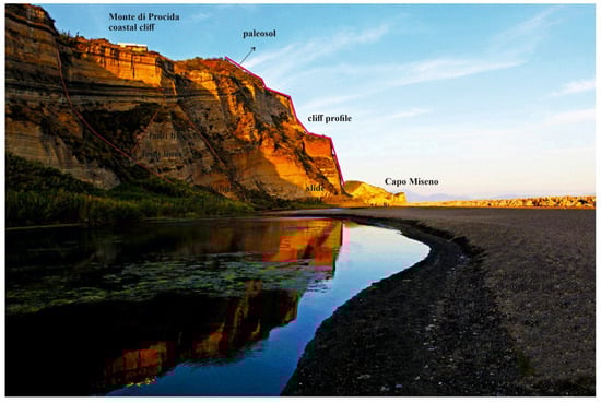 The corresponding outcrop, located at the coastal cliff of M.te di Procida (Figure 6; https://www.facebook.com/photo/?fbid=1015372813977389&set=pcb.1015372903977380; accessed on 1 August 2025), shows a thick pyroclastic sequence with interlayered paleosols. The post-caldera activity has developed in four main phases, identified through radiometric determinations and paleogeographic evolution, from 37 ky B.P. to historical times.