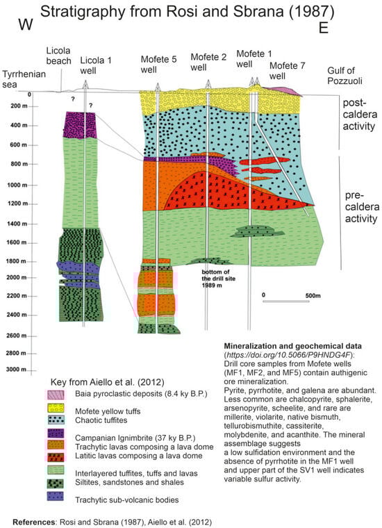 Stratigraphy and geochemistry of the geothermal area of Mofete (Phlegrean Fields). The stratigraphic data are modified from Rosi and Sbrana (1987) [50] and Aiello et al. (2012) [26]. The mineralization and geochemical data have been modified from https://doi.org/10.5066/P9HNDG4F (accessed on 19 May 2025) and have been provided by Harvey Belkin, Ryan McAleer, Benedetto De Vivo, and Mary R. Croke (record source: https://www.usgs.gov/ais; accessed on 1 August 2025).
