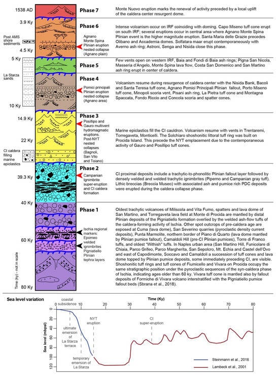 Stratigraphy of the Phlegrean Fields volcanic complex (modified from Sbrana et al.) [74]. For the details of the volcanic phases, refer to Table 2.