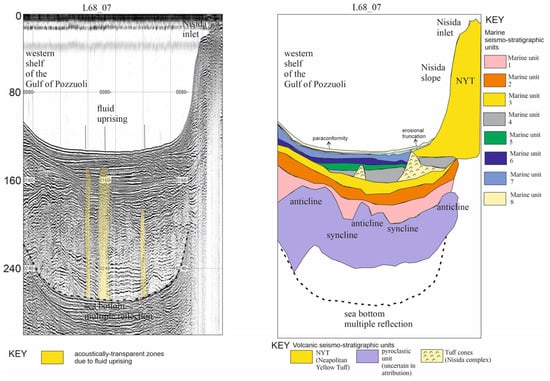 The geological interpretation of the seismic profile L68 shows the fluid uprising in correspondence with anticlines, deforming the marine deposits (Figure 10). The fluid uprising is suggested by the occurrence of acoustically transparent vertical zones, interrupting the lateral continuity of the marine record (Figure 10). Both marine and volcanic seismo-stratigraphic units have been identified (Figure 10). The lowermost unit, interpreted as a pyroclastic unit, whose attribution is uncertain, is deformed by anticlinalic structures, namely three anticlines which are separated by two synclines (Figure 10). These structures could be genetically related to the resurgent dome occurring in the area, as highlighted by previous studies [18,59,60,61,75,76,77,78]. Other important seismo-stratigraphic units include the Neapolitan Yellow Tuff (NYT), occurring from the Nisida inlet to the Nisida slope (Figure 10), and the tuff cones of the Nisida complex (Figure 10).