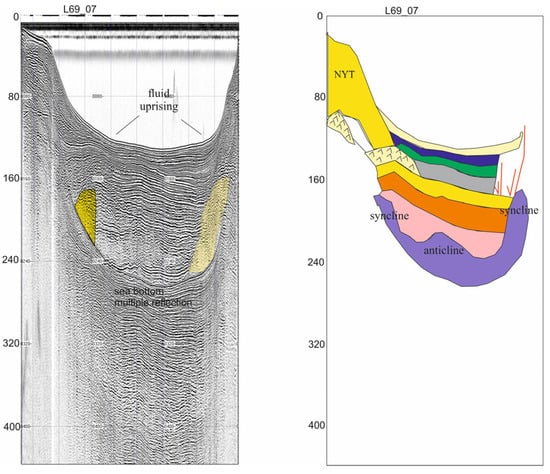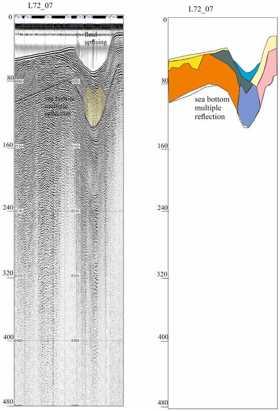 A similar stratigraphic architecture has been detected in the seismic profile L69_07 (Figure 11). Two zones of fluid uprising have been detected in correspondence with two synclinal structures, highlighting that the fluids may have been concentrated in the depressed areas (Figure 11).