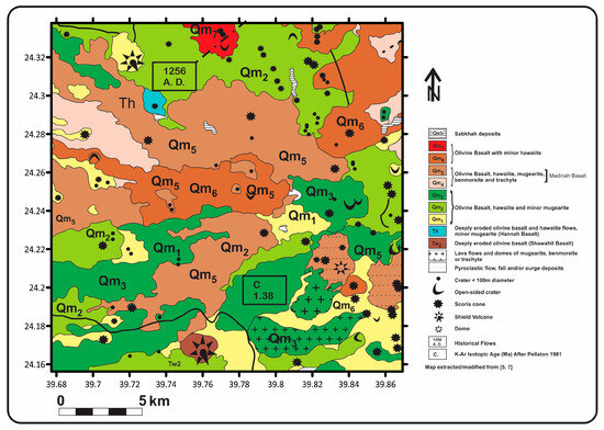 - Robinson, J.E.; Downs, D.T. Chapter R: Overview of the Cenozoic geology of the northern Harrat Rahat volcanic field, Kingdom of Saudi Arabia. In Active Volcanism on the Arabian Shield-Geology, Volcanology, and Geophysics of Northern Harrat Rahat and Vicinity, Kingdom of Saudi Arabia; Sisson, T.W., Calvert, A.T., Mooney, W.D., Eds.; U.S. Geological Survey Professional Paper 1862 [Also Released as Saudi Geological Survey Special Report SGS-SP-2021-1]; U.S. Geological Survey: Reston, VA, USA, 2023; 20p. [Google Scholar] [CrossRef]