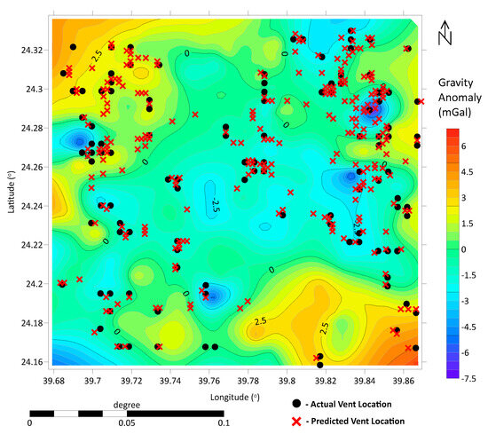 Overlaid display of observed and forecasted volcanic vents plotted against the gravity anomaly map. The predicted outcomes reveal potential new vent locations while also identifying areas containing previously documented vents through our analytical methods. Spatial agreement between observed and modeled vent positions reaches 75% with a 95% degree of certainty (DC).