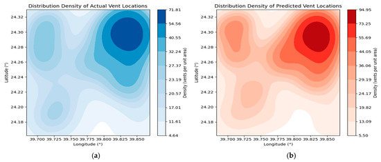Kernel density estimation (KDE) maps showing the spatial distribution of (a) actual volcanic vent locations and (b) predicted volcanic vent locations in the Rahat volcanic field. Density surfaces were generated using a Gaussian kernel with a fixed bandwidth, applied uniformly to both datasets to ensure comparability. Warmer colors indicate higher vent concentration. The high degree of similarity between the two maps reflects the model’s ability to reproduce observed spatial patterns.