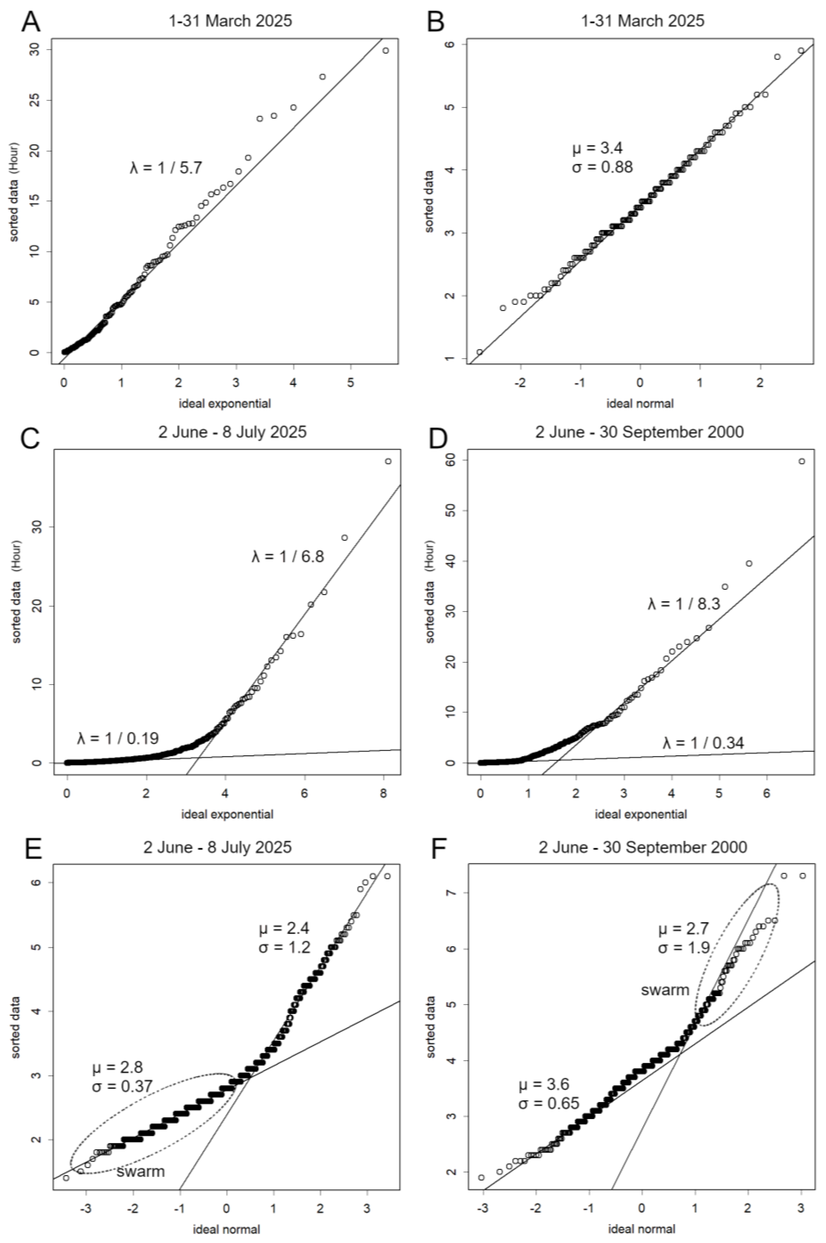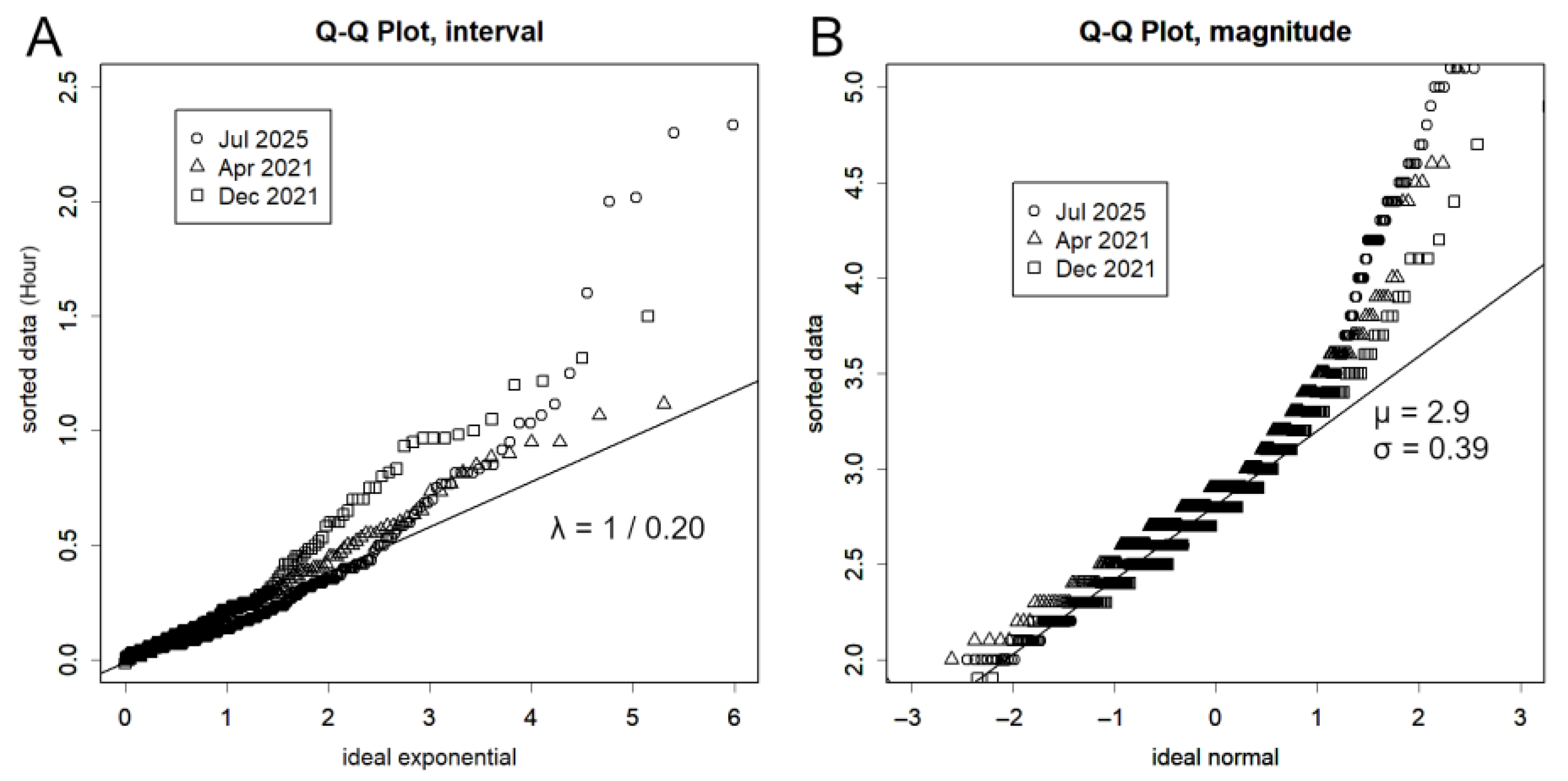 6]. EDA facilitates data analysis by visualising patterns while identifying an optimal statistical model. The primary method employed here is the quantile–quantile (QQ) plot, which compares the quantiles of the observed data with those of a theoretical distribution model. This approach enables a more rigorous assessment of distributional fit than a histogram; if the data conform to the model, the quantiles exhibit a linear relationship.