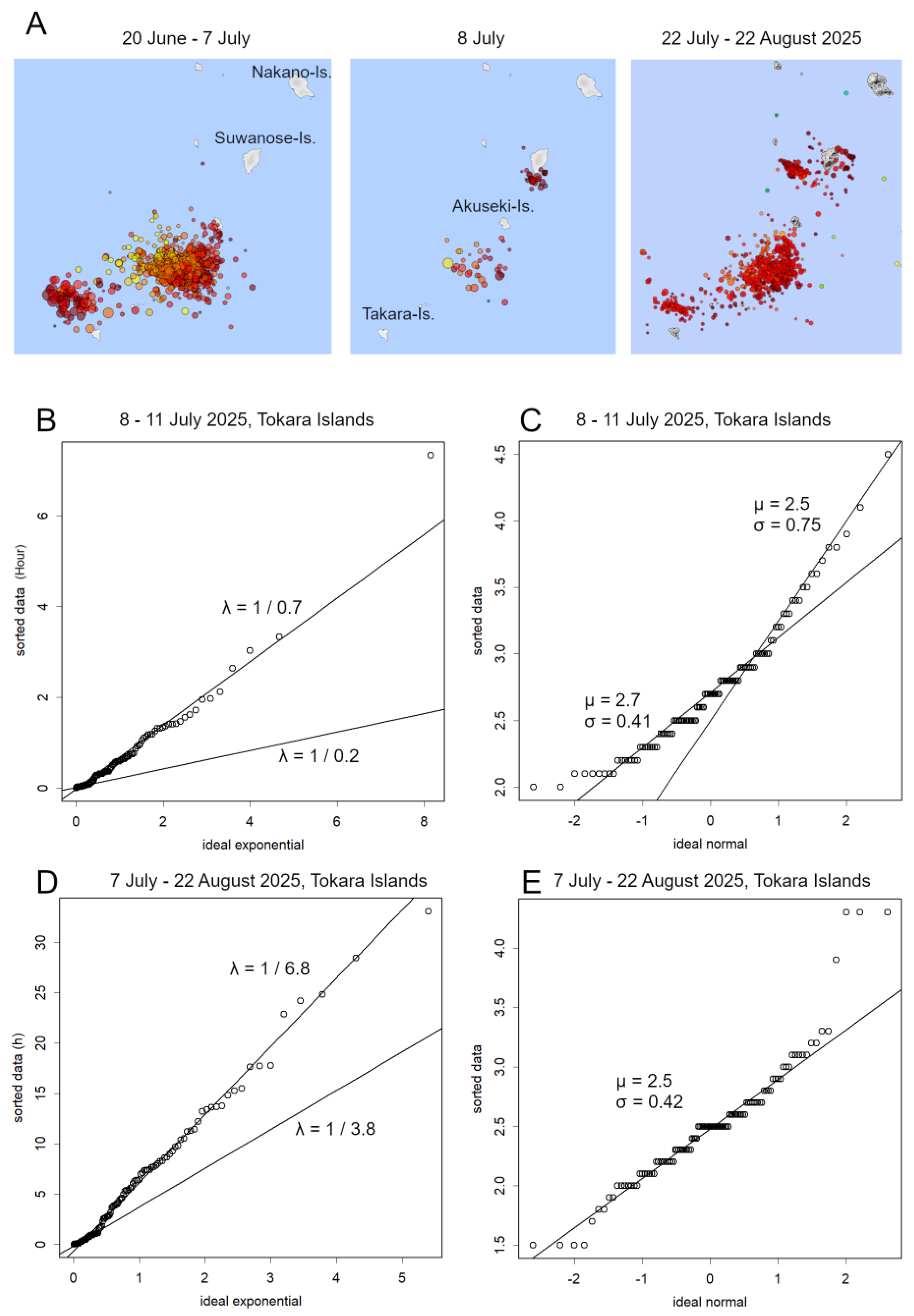 15]. As demonstrated in this study, understanding the distributional patterns of earthquake inter-event times and magnitudes enables the estimation of parameters (λ, μ, and σ), which can be directly compared with other observational datasets. These parameters also facilitate the estimation of event frequencies, providing critical information for predictive modelling. Access to quantitative measurements of the 2021 Suwanose Island eruption and its associated seismic activity would enable robust comparisons with the 2025 conditions. Observations of potential shifts in island positions suggest the possibility of large-scale geological changes [