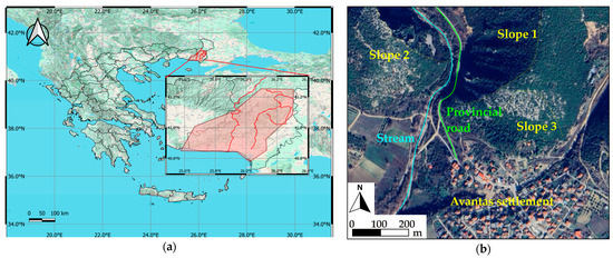 (a) Relative location of the study area with respect to Greece. (b) Aerial photo of the Avantas study area.