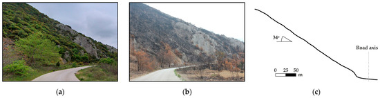 Rockfall occurrence is influenced by multiple factors, including slope characteristics such as slope gradient, geology, weathering, and vegetation, as well as external factors like climate, seismic activity, and the impact of human activities [6]. Several studies in the literature report an increase in rockfall activity during and after wildfires [4,7,8,9,10], which alters both the detachment area and the propagation zone. Key changes induced by wildfire include the fragmentation of rock exposures due to high temperatures accompanied by changes in mechanical properties, the loss of the protective function of vegetation, the impact of firefighting activities, and/or the effect of extreme heat on existing protective measures [10,11].