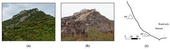 The structure and composition of forests can change abruptly and significantly after wildfires, substantially affecting their protective capacity against rockfalls [20]. The impact of wildfire on vegetation depends on the intensity and duration of the fire [10]. The loss of vegetation causes an increase in rockfall events [7,8], which appears to be more pronounced in the weeks or months following the wildfire, and becomes intensified after periods of heavy rainfall.