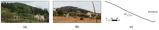 Slope 3 is situated on the northern side of the settlement and has a gentler inclination (mean gradient 24°) and greater slope roughness compared to Slopes 1 and 2. Residences are located at the base of the slope, making the rockfall exposure continuous. A residence that was destroyed by the fire is discernible (yellow circle) in Figure 4. Before the fire, the residence was barely visible due to the dense vegetation.