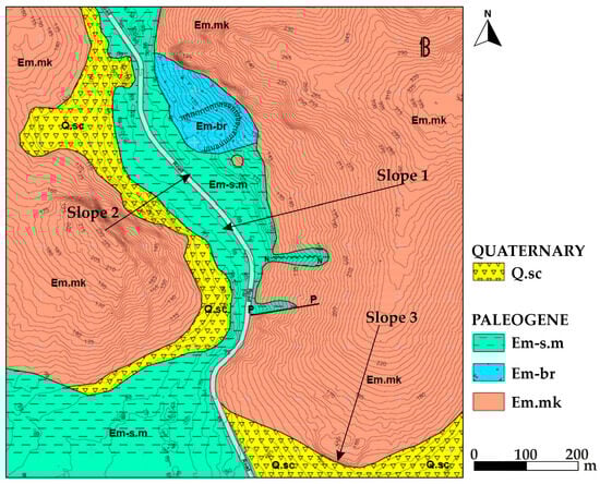The geological mapping (Figure 5) was conducted at a scale of 1:5000, using the digital elevation model (DEM) from the Hellenic Cadastre as a topographic base in raster format with a 2 m grid. The area is dominated by unbedded, slightly to moderately weathered limestone (Em.mk), which, in places, is significantly fragmented and marls and clays with layers of sandstones (Em-s.m). At the foot of the slopes, scree deposits (Q.sc) are present, consisting mainly of marly limestone fragments, accompanied by soil erosion rills. Additionally, there is evidence of a rotational slide on the conglomeratic breccia (Em-br).
