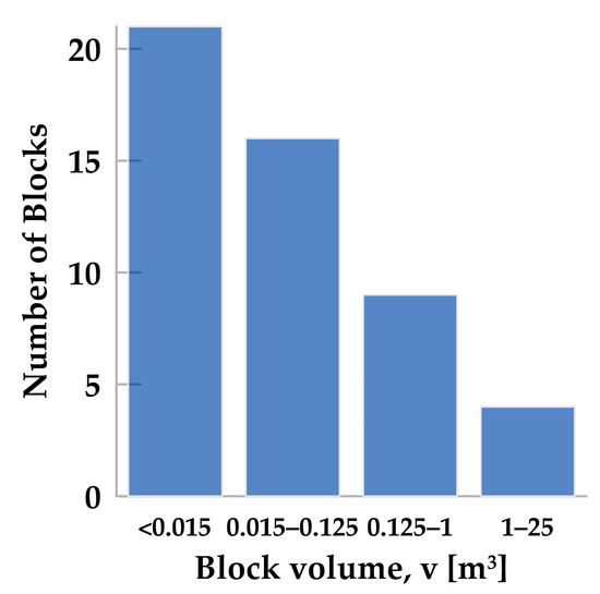 We documented the detached blocks located at the base of the slopes. We measured the representative dimensions for each block in three perpendicular directions and calculated their volume, assuming a prismatic shape. Figure 6 displays the volume distribution of the blocks, which ranges from less than 0.01 m3 to over 50 m3. This volume corresponds to a mass varying from approximately 25 kg to more than 125 tons.