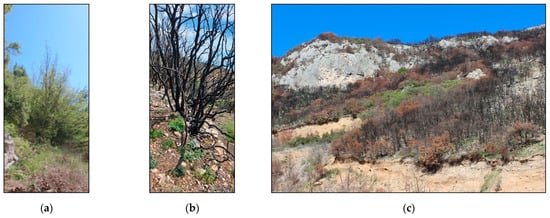 Vegetation before (a) and after (b) the fire, as well as a general view of current vegetation conditions (c).