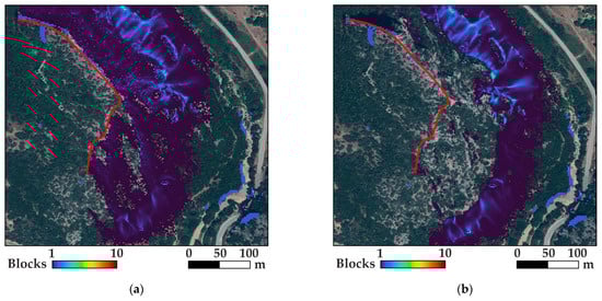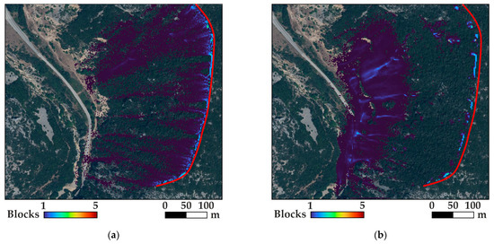 Figure 8 displays the endpoints of trajectories at Slope 1, using blocks with a volume of 0.01 m3. When vegetation is present (before the wildfire, Figure 8a), most blocks stop across the slope, and few reach the road. In the absence of vegetation (as shown in Figure 8b) or when it is destroyed after a wildfire, the blocks travel further down the slope, resulting in the south end of the road being covered with debris. This indicates that vegetation plays a crucial role in controlling the trajectories. Therefore, the run-out distance increases following the wildfire, raising exposure. As mentioned previously, exposure is an important hazard and risk assessment factor.
