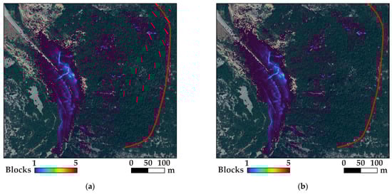 When examining larger blocks, the role of vegetation in controlling rockfalls appears to diminish. Figure 9 illustrates the trajectory endpoints at Slope 1, using blocks of 0.125 m3. The distinction between the trajectory endpoints without and with vegetation, as shown in Figure 9a and b, respectively, is barely noticeable. There is a slight effect of vegetation, primarily observed in the middle of the slope, but it does not substantially reduce the run-out distance. This is attributed to the vegetation’s ability to withstand impacts since no other parameters differ between these two analyses. The vegetation in the area is not particularly robust; it consists of small trees that cannot dissipate significant kinetic energy. As the block size increases, the resulting kinetic energy upon impact also increases, making the vegetation less effective. Consequently, the effectiveness of vegetation in controlling rockfalls is highly dependent on the falling block’s kinetic energy, which increases with its mass.