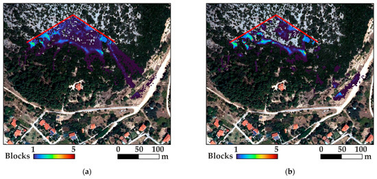 Figure 8, Figure 9, Figure 10 and Figure 11 display the trajectory endpoints overlaid on the orthophoto of the Hellenic cadastre captured before the fire. Both scenarios—one after the wildfire (without vegetation) and the other before the wildfire (with vegetation)—are presented side by side for easier comparison. The dots are color-coded based on the number of blocks that stop within each cell. The detachment source, i.e., the slope’s apex, is indicated with a red line.