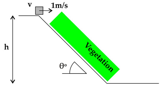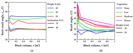 As demonstrated from the detailed site-specific study in Section 2, the parameters influencing trajectory length, thus reach angle, are: (a) slope height, (b) slope angle, (c) vegetation density, and (d) block size. To estimate the trajectory length, we conducted parametric analyses using RocFall2 v.8 software [44] by varying the aforementioned parameters within their typical range for the broader study area. The parametric analysis was conducted using the rigid body method, which considers the block’s shape and mass. The method considers the impulse reaction of the block during the instantaneous contact period with the slope to determine its response to impact [45]. The input parameters (Normal (Rn) and Tangential (Rt) Coefficient of Restitution, Dynamic and Rolling Friction) were selected by RocFall2 [44] suggested values for Rock Debris/Soil slopes.