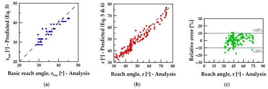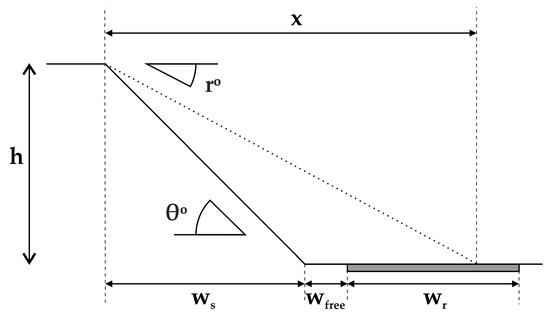 Reach angle (r), introduced as Fahrböschung angle in the work of Heim [41], is formed by the horizon and the line connecting the detachment position and the furthest trajectory endpoint. The reach angle concept has been used, with variations, in relevant rockfall and landslide studies, for example, [42,43] and others.