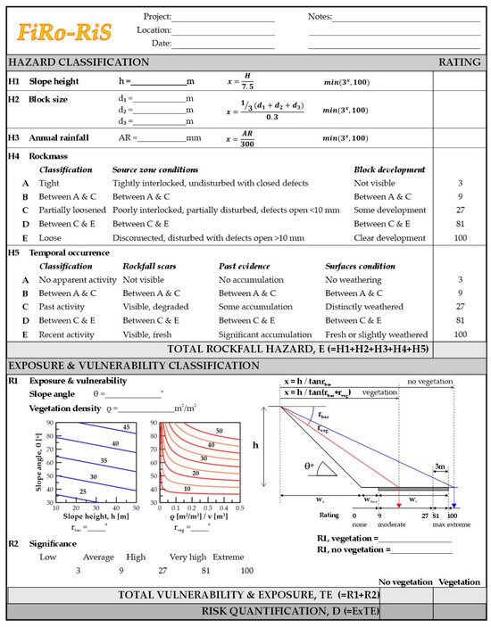 Defining a natural hazard requires assessing susceptibility, magnitude, intensity, potential run-out area, and frequency [25]. Concerning rockfalls, geological features, properties of geomaterials, and weakening factors describe rockfall susceptibility. The volume of rock blocks expresses the magnitude of a rockfall. The event’s intensity is described by the kinetic energy or the velocity of the falling blocks and can be indirectly deduced from the detachment height. The run-out area is typically estimated through trajectory simulation or other parameters such as slope gradient and height. Finally, for the common case that a detailed historical rockfall inventory is absent, frequency is generally assessed based on general information and field observations, such as the presence of rock blocks at the slope base, impact marks on the slope face, or roadway damage. The original RHRS meets these requirements.