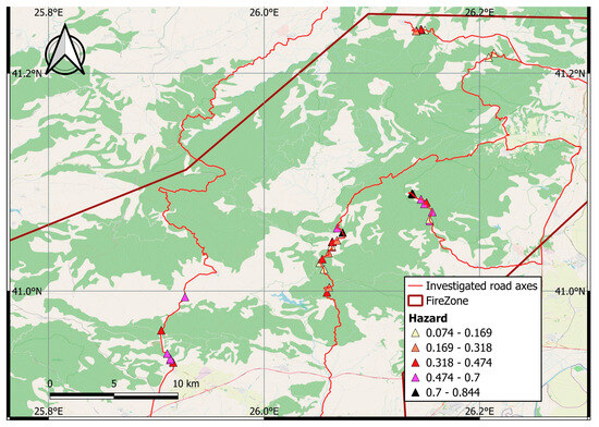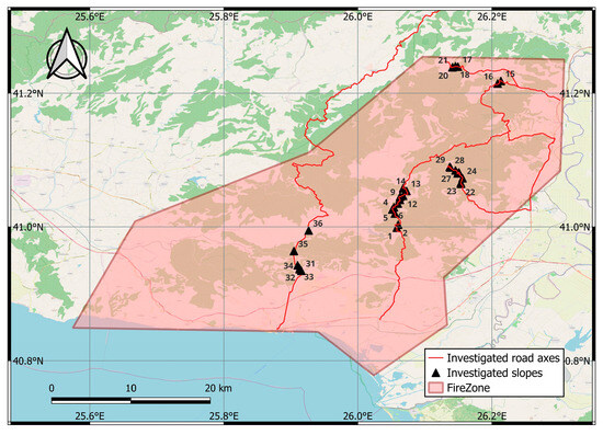 The developed Rockfall Hazard-Risk System (FiRo-RiS) was applied during an on-site inspection one year after the devastating wildfire. The surveyed routes included the mountainous road network and settlements impacted by the wildfire. Along these routes, 36 slopes were identified and examined (Figure 17).