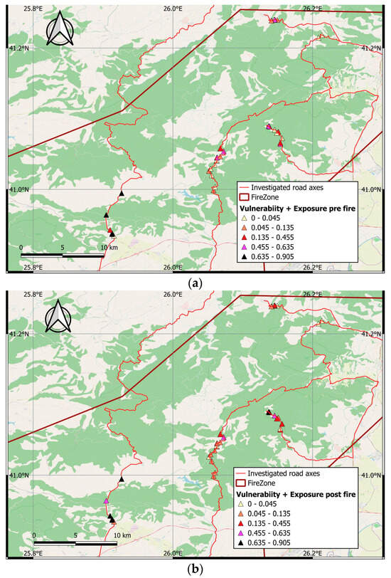 Normalized Vulnerability—Exposure (VE) maps (a) before and (b) after the wildfire.