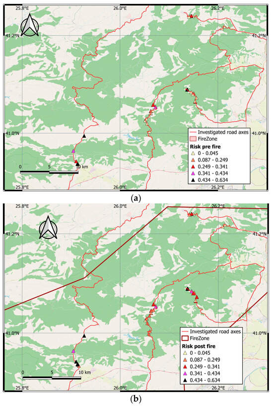 Normalized Risk (R) maps; (a) before and (b) after the wildfire.
