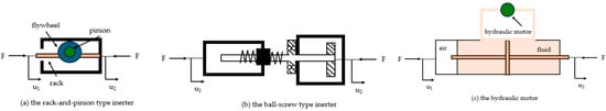 Inerter is a lightweight mechanical mass element that connects two independently moving nodes and generates inertial force in response to the relative acceleration at their endpoints [4]. The inerter force can be defined by Equation (1). In Equation (1), and are the accelerations at the two terminals. b is the inertia and its unit is kilogram. Figure 2 shows chematic representation of the inerter and Figure 3 shows examples of inerter devices.