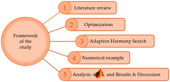 The parameters of the algorithm such as HMS (harmony memory size), HMCR (harmony memory consideration rate) and PAR (pitch adjustment rate) are defined. After defining the stopping criterion (maxiter), the design variables and their lower and upper limit ranges, the Harmony Memory (HM) matrix is created. This matrix consists of solution vectors, and the size of the matrix represents the number of solutions to be stored in memory. The solution vector is constructed to contain as many design variables as the previously defined HMS and the size of the population of solution candidates is defined as the harmony memory size (HMS). Each design variable is generated by randomly selecting within the defined solution ranges. Therefore, when HMS is n, n randomly selected solution candidates are generated within the defined boundaries and stored in the HM matrix as shown in Equation (2). Each column of the matrix in Equation (2) represents a design variable. After analyzing the solutions, the objective functions are calculated for each solution in the harmony memory matrix (Equation (2)). After these calculations, the solutions are organized in the matrix in ascending order according to their objective function values. In Equation (2), f(xi) is the value of vector xi in the objective function.
