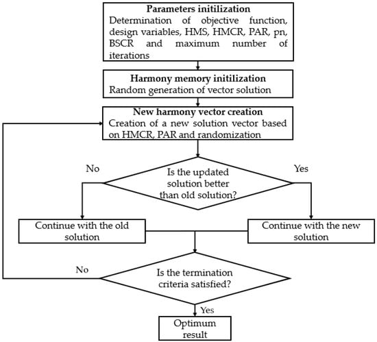 In Equations (5) and (6), mt is the number of iterations and t is the iteration number, while HMCRinitial and PARinitial are the initial values of HMCR and PAR, respectively. Figure 6 shows the AHS flowchart.