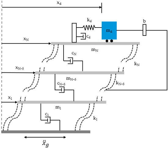 The equation of motions of an N-story shear building controlled by the TMDI system can be expressed in matrix form using Equation (7). In Equation (7), the displacement vector x(t) is used, which includes the relative displacements of each floor relative to the building and the displacement of the TMDI. The mass (M), stiffness (K), and damping (C) matrices are combined with this vector to form the motion equation.