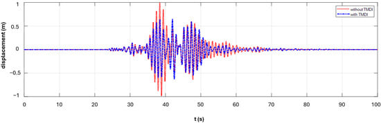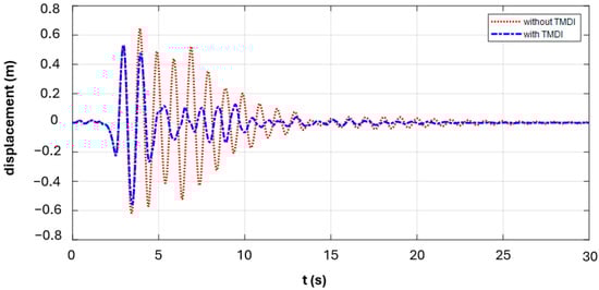 As a result, the TMDI reduced displacement by 35% and 13.33% for non-pulse and pulse, respectively. The reason why non-pulse shows better displacement reduction performance than pulse is that pulse contains high-period characteristics. Due to the high-period pulse, it deviates from the structure’s period and, consequently, from the TMDI period optimized based on the structure’s period. This situation leads to lower effectiveness of the TMDI system in pulse recordings.