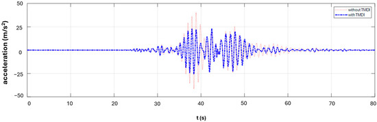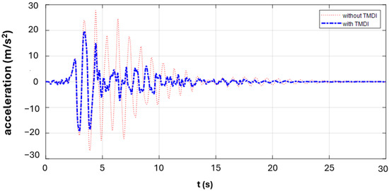 When examining the red and blue lines in Figure 8 and Figure 9, it can be seen that structural control can be effectively achieved with optimum TMDI parameters. For the case where the TMDI system is connected to the 5th floor of the building, the displacement and graph of the critical earthquake record (NORTHR/RRS_032) obtained from near-fault pulse earthquake records for 1.5 stmax and 5% mass ratio (µ) values is shown in Figure 10, and the total acceleration graph is shown in Figure 11.