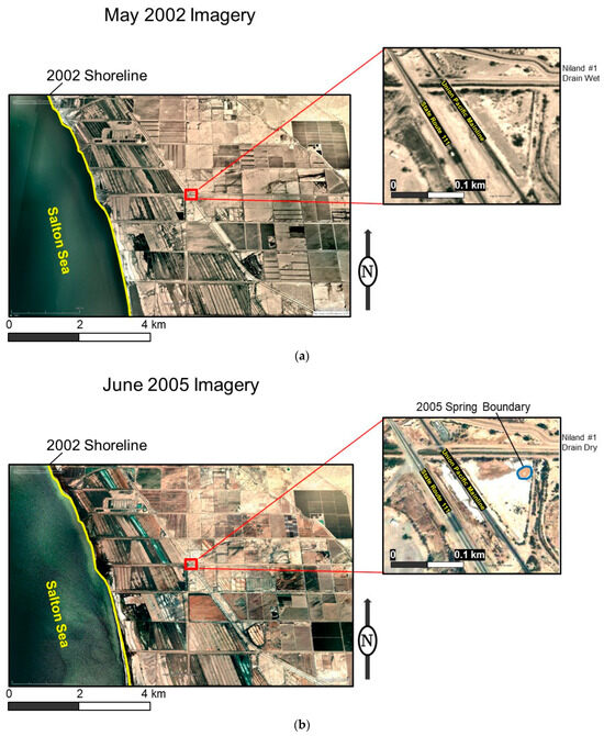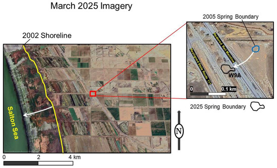 Due to additional containment measures, particularly spring dewatering and local degassing, W9a’s movement slowed significantly (Figure 8). By 2023, W9a appeared to stabilize, and as of 2025, it remains relatively stationary, although the mud spring’s surface dimensions have continued to expand (Figure 8). The original W9 spring no longer exhibits visible surface activity, while W9a remains the primary threatening feature. Although currently stabilized, its long-term behavior and potential risk to surrounding infrastructure remain uncertain. Figure 8 illustrates the key developments discussed between 2002 and 2025. The references cited above provide very detailed documentation of the engineering interventions, stabilization efforts, and impacts on transportation and utility infrastructure. Figure 8 also illustrates the progressive retreat of the Salton Sea shoreline alongside the migration of the Moving Mud Spring. A particularly noteworthy correlation emerges between the timing and sub-parallel movement of the shoreline and the mud spring from the initial appearance of W9 (coinciding with the enactment of the Quantification Settlement Agreement; [67]) to the later separation of W9 and W9a during the period of most rapid sea-level decline. The correlation model complements existing conceptual models for mud spring movement, which [2] acknowledge are not strongly anchored in empirical data. The movement of the mud spring and the retreat of the shoreline align with the hydraulic head gradient observed in the study area (compare Figure 5 and Figure 8).