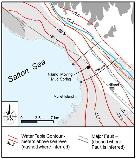 Canal seepage historically created a groundwater mound exceeding 21 m on East Mesa [18]. Since lining, water levels have declined. USGS, monitoring well 11S/15E-23M, 16 km southeast of Niland, dropped from 6.3 m bgs in 1979 to about 15 m bgs by 2020 [12]. Current data suggest groundwater elevations remain highest in the mountains and East Mesa, declining toward Imperial Valley and the Salton Sea, broadly following topography but locally influenced by faults and transmissivity variations in the saturated strata [12]. A 1993 composite hydraulic head map [13] aligns water-table contours with both the regression of the Salton Sea shoreline and the trajectory of the Niland Moving Mud Spring (Figure 5; compare to Figure 2).