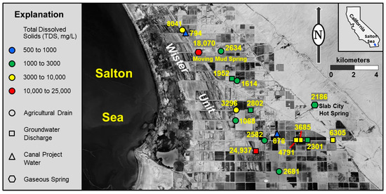 Figure 6. Total dissolved solids (TDS) increase progressively from canal water (794 to 878 mg/L) to drain water (1088 to 8041 mg/L) to shallow groundwater (1952 to 24,937 mg/L), reflecting cumulative salt loading from irrigation and leaching. The Slab City Hot Spring shows moderately elevated TDS (2186 mg/L), while the Niland Moving Mud Spring exhibits much higher values (17,889 to 18,693 mg/L), consistent with interaction with saline or evaporite-rich strata. These patterns highlight distinct geochemical signatures between surface, agricultural, and geothermal water sources. Total dissolved solids map for samples collected during the study, are shown in Figure 1 and Table 2.