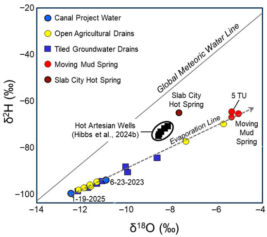 Figure 7. Stable water isotope data for drain and shallow groundwater samples plot along an evaporation trajectory originating from imported Colorado River water, with the Global Meteoric Water Line [57,58] shown for comparison. The Moving Mud Spring falls within this same isotopic range, a finding confirmed by two subsequent sampling campaigns and supported by tritium data (~5 TU), indicating modern recharge within the past 2 to 6 decades. The circled group of Hot Artesian Wells, sampled in the Geothermal Spa area about 17 km northwest of Moving Mud Spring, represents locally sourced, older groundwater with no detectable tritium and 3.5 PMC, and is plotted for comparison to the Slab City Hot Spring [59]. Slab City Hot Spring shows isotopic values consistent with locally recharged geothermal water, distinct from the imported water signature. These results demonstrate that the Moving Mud Spring is fed by evaporated Colorado River water, highlighting its connection to regional surface hydrology and irrigation systems. The isotopic shift in Canal Project Water shown by date sampled reflects extremely low storage in Lake Mead and other Lower Colorado River Basin reservoirs during summer 2023, which began to recover somewhat following wetter years and increased snowmelt runoff after summer 2023.