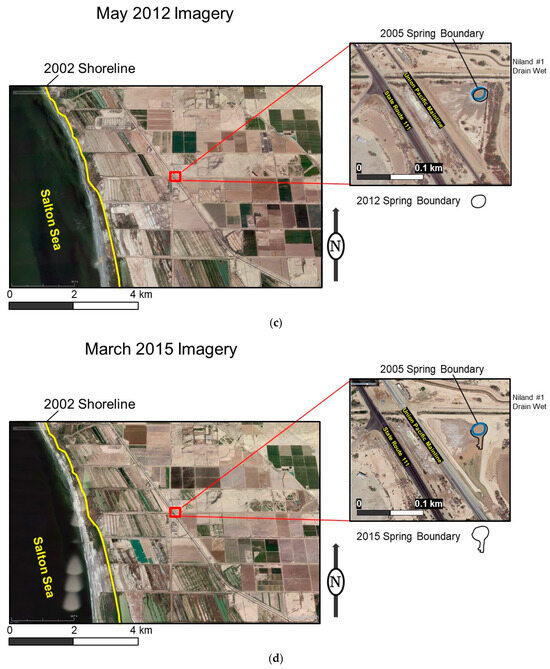 Time-series imagery reveals that the Moving Mud Spring began migrating southwest around 2012 to 2016, accelerating from a slow annual rate to nearly three meters per month at peak movement, eventually spanning over 100 m by 2021. This movement closely parallels the retreat of the Salton Sea shoreline over the same period, which has dropped approximately 4.1 m since 2002 (Figure 8). The strong temporal and spatial correlation between shoreline recession and spring migration suggests a cause-effect relationship where declining lake levels alter hydraulic gradients, increasing lateral groundwater velocities and shifting the pathways of CO2-charged water rising to the surface. Although mitigation efforts since 2018, such as decompression wells, sheet pile barriers, and extensive infrastructure stabilization, may have largely arrested spring migration for now, the underlying hydrologic forces remain active, and the spring’s long-term behavior remains uncertain.
