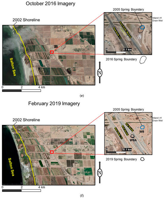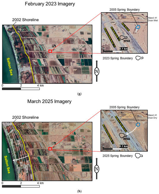Figure 8. (a) Mud Spring W9, the predecessor to the Moving Mud Spring, is absent in 2002 aerial imagery. This image serves as the baseline for comparison with all subsequent imagery through 2025. (b) Mud Spring W9, outlined in blue, formed or reactivated in 2005. Between 2002 and 2005, the Salton Sea shoreline showed only minimal retreat. (c) By 2012, the Salton Sea shoreline had begun to show signs of retreat. Mud Spring W9, outlined in blue, had slightly expanded and altered its boundaries. (d) By 2015, the Salton Sea shoreline had continued to retreat, and Mud Spring W9 had begun to enlarge and shift slightly. (e) By 2016, Moving Mud Spring W9 had expanded to the outhwest and was beginning to split into Spring W9a. The Salton Sea shoreline had begun receding more rapidly since 2015. (f) By 2019, Moving Mud Spring W9a had split from Mud Spring W9 and migrated toward the mainline track, prompting construction of temporary “shoofly” rail detours alongside the original rail line. The Salton Sea shoreline continued to recede at a rapid rate since 2016. (g) By 2023, aggressive containment efforts, including spring dewatering and local degassing, had significantly slowed the movement of W9a, though it had already migrated dozens of meters southwest since 2019. The Salton Sea shoreline continued to recede over this period. (h) Since 2023, W9a has shown minimal southwestward movement due to continued aggressive containment measures. The spring’s boundaries have expanded by approximately 15% since 2023. The Salton Sea shoreline continues to retreat, with white lines tracing its progressive recession from the series shown in Figure 8, from 2002 to the current 2025 extent.