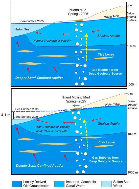 No known faults or structural features align with the mud spring’s movement; major structural trends, including significant fault systems, run perpendicular to its path [2]. The concurrent movement of the shoreline and mud spring may represent the strongest potential cause–effect relationship observed to date. Stabilization efforts since 2018 probably have slowed and nearly arrested the movement of W9a, artificially affecting recent correlations. Ref. [1], citing personal communication from A. Hernandez in 2007, described how managed wetland cycles influence mud pot activity: “Some of the ponds are filled with fresh water in late summer to accommodate migrating birds… In 2006, new gas vents developed in water delivery channels.” Given that Salton Sea decline had already begun between 2002 and 2006, the appearance of new mud pots may be linked to changing sea level and water table hydraulic gradients. The 4.1 m drop in Salton Sea level between 2003 and 2025 (Figure 2 and Figure 8) altered hydraulic head laterally and vertically across shallow and deeper aquifers. The Sea acts as a regional, shifting hydrogeologic boundary and ultimate discharge zone for groundwater. These head changes particularly would be expected to affect shallow aquifers characterized by lateral flow between semi-pervious fine-textured layers (Figure 9). Changing hydraulic heads between the Moving Mud Spring and Salton Sea could influence lateral gas migration with flowing groundwater, as well as the formation of new mud pots, especially close to areas where geothermal plants withdraw and reinject groundwater under high pressure.