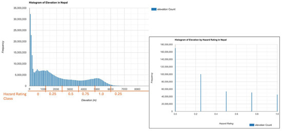 Hazard rating thresholds were determined for each layer by the authors, based on experience and published research, and assigned to the raw data value of each pixel within each layer to produce a hazard rating layer (e.g., [21,39]). Deviated from the values used within [30] was required as the range of values found within the study area was greater due to the country-wide approach being taken. To ensure broad coverage across Nepal’s topography, elevation histograms were produced and used to define approximately equal distribution bands, which were then aligned with general trends in landslide and flood susceptibility. The distribution histogram can be seen in Figure 2, which shows how the elevation data used in the landslide layers was split into the five hazard rating values. Elevations of 4800–6000 m were deemed to pose the greatest contribution to a potential landslide and so pixels with a value between 4800 m and 6000 m were classified as 1. Pixels with a value between 3600 m and 4800 m were classified as 0.75; 2400 m to 3600 m were classified as 0.5; values of 1200 m to 2400 m were classified as 0.25; values over 6000 m were classified as 0.25; values under 1200 m were classified as 0. The hazard indices assigned here closely align with work undertaken by [39].
