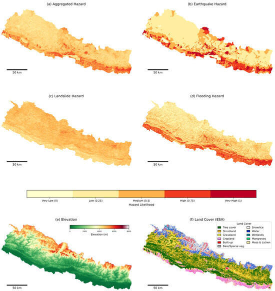 Examples outputs for Nepal from MiMapper: (a) Aggregated hazard, (b) Earthquake Hazard, (c) Landslide Hazard, (d) Flooding Hazard, and the raw data input layers for (e) Elevation (SRTM), and (f) Land Cover (European Space Agency) showing the spatial variability in each of these six layers within MiMapper. Further detail can be explored by accessing MiMapper (https://ee-multihazardmapping.projects.earthengine.app/view/mimapper (accessed on 23 September 2025)).